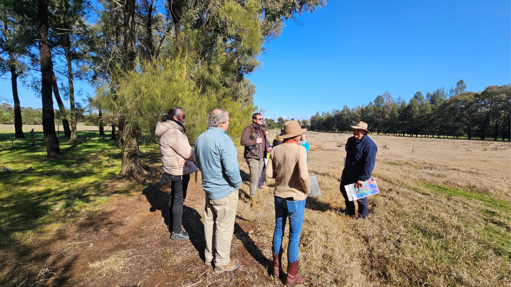 A whistle-stop tour of two sites allowed us to show how strategic tree planting and management play vital roles in erosion control, animal welfare & microclimate formation (via shelter belts) and salinity management. We explained the geological features of our landscape and how Cowra came into being, our precious native Box Gum grassy woodland habitat and the role we play in its regeneration, plus sustainable grazing practices & farm management.