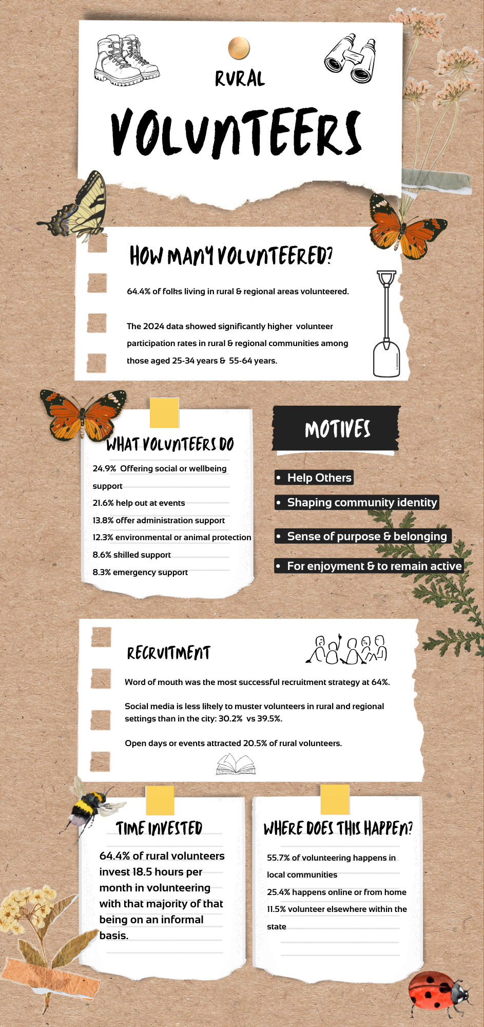 We’ve pulled out some key data from the rural and regional volunteers chapter of the report and collaited it in an infographic below. You can read the full set of reports by following this link to the NSW government website where all of the reports can be downloaded for free.