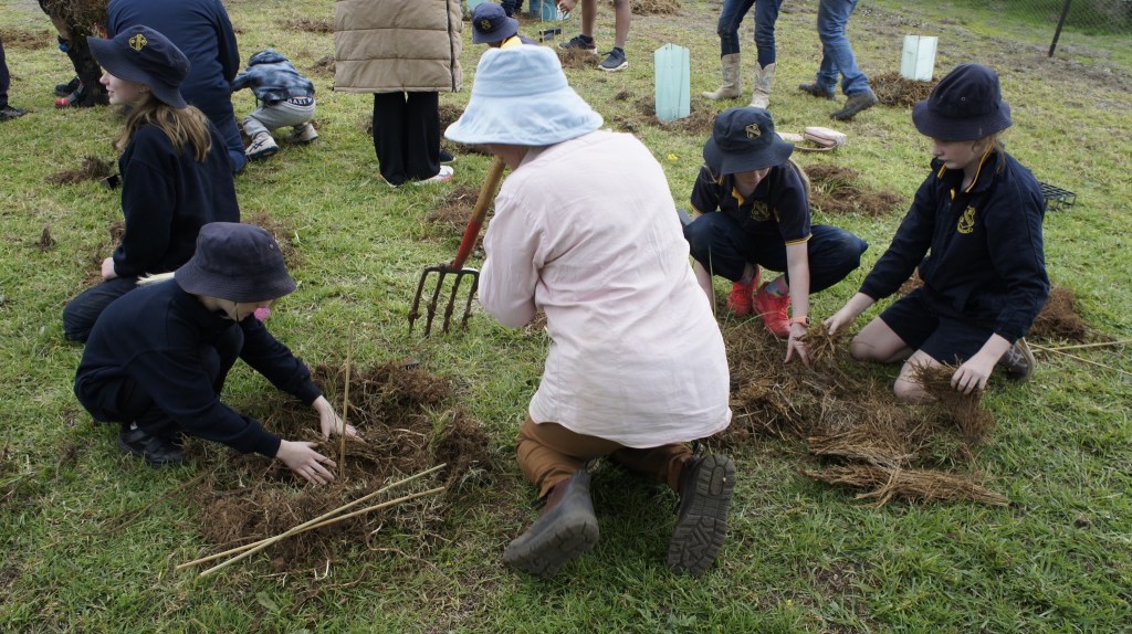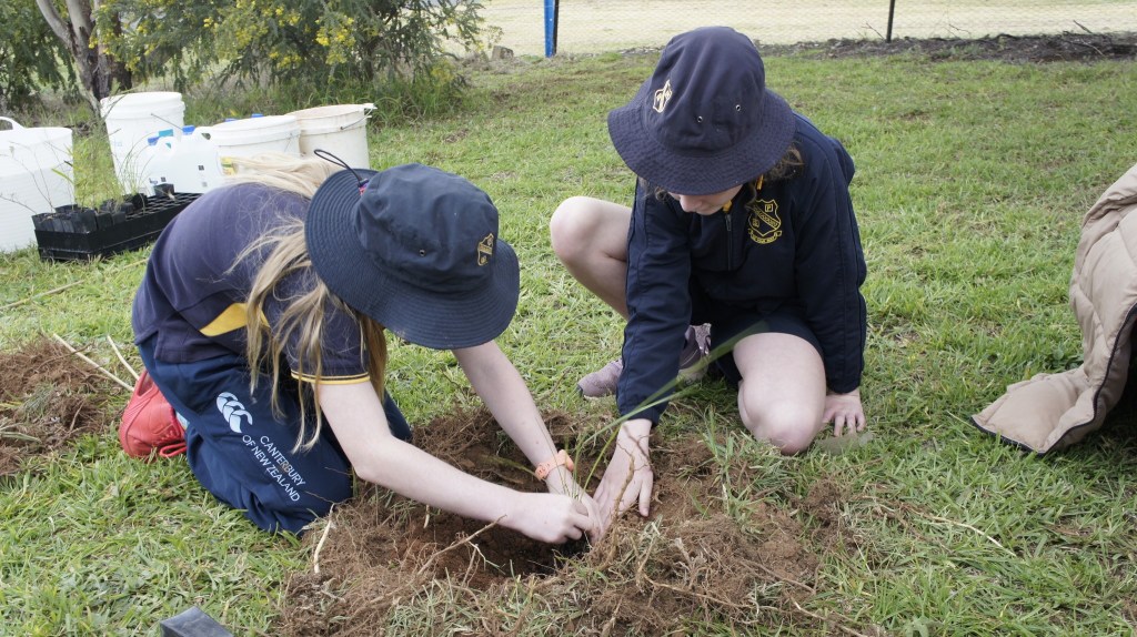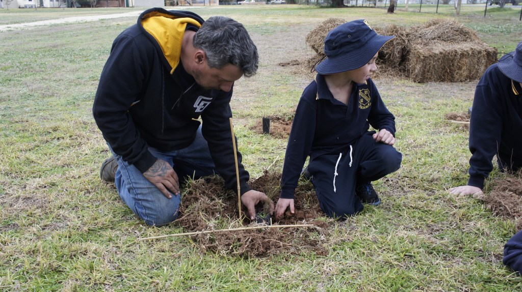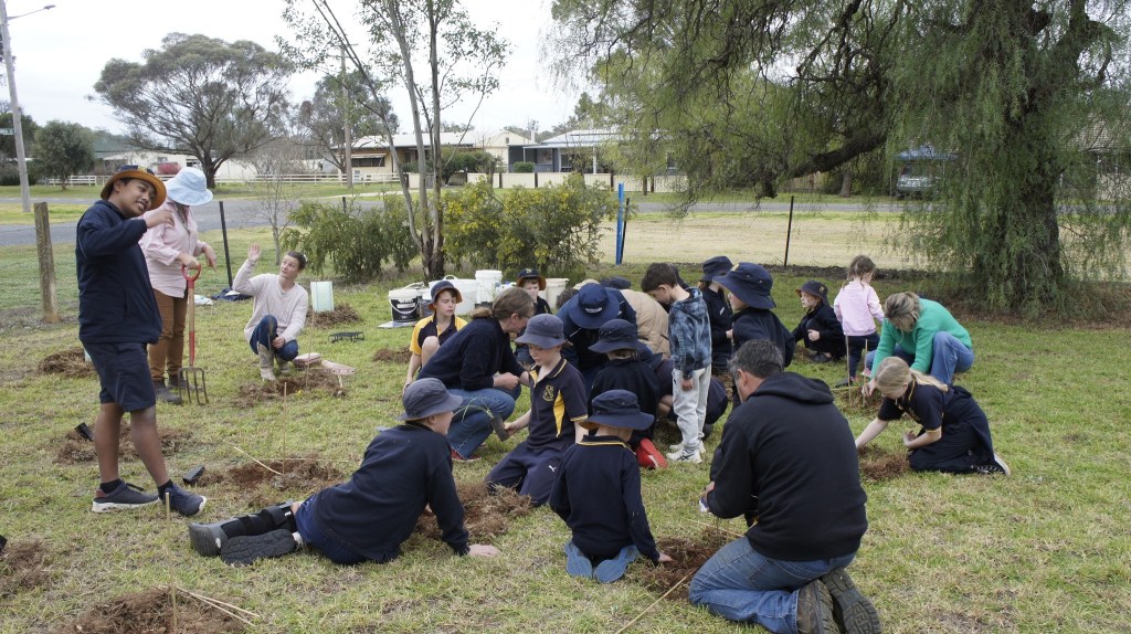 Under the guidance of Kangarooby Landcare’s Ruth Workman, a willing team of students along with their teachers and parents, got stuck into some serious planting in the corner of their school’s playing field.
