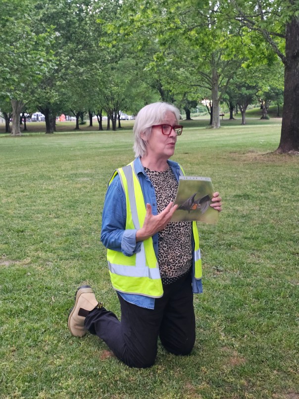 I was introduced to Sandra through the Australasian Bat Society’s Bat Night Coordinator Maree. Sandra lives hear a large bat camp in Sydney and, having family in Cowra was happy to make the drive. On meeting Sandra, I realised we’d struck gold – she was a wealth of knowledge and enthusiasm, keeping us enthralled for a good two hours while we waited for and then watched the flying foxes leave their roosts.