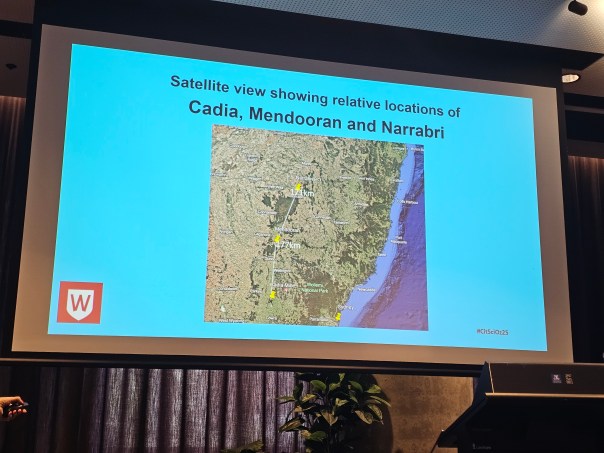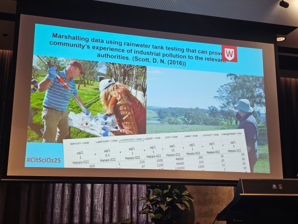 During lunchtime on day two I attended a very interesting symposium entitled “We Are the Monitors Now”: How Rural Communities Are Initiating Pollution Monitoring and Using Citizen Science for Environmental Outcomes by Anna Christie and Ian Wright. Ian has been out to our region to talk on the PFAS levels in the Belubula river so it was great to catch up with him. This talk focused on water quality in rural communities, more specifically around how airborn dust and roof-contaminants impact tank water quality. This talk was a real eye opener and brought home the impact invisible pollutants have on both ourselves and our ecosystem.